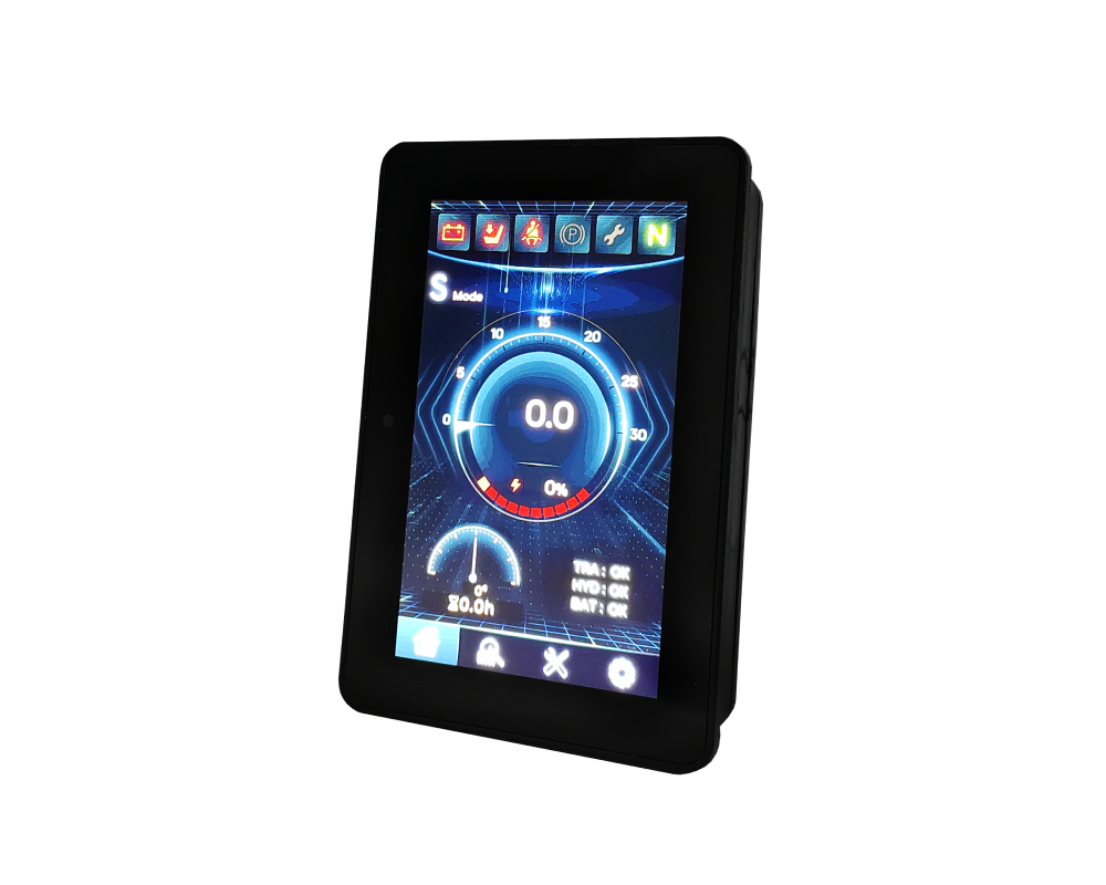 5 寸触摸屏叉车仪表,可实时显示行驶速度、工作模式(前进 / 后退、高低速)、电动 / 内燃叉车对应数据(电池电压 / 电量或燃油液位 / 水温)、货叉高度、载重、里程时间;集成故障代码、报警提示(超速、低电量等)及保养提醒,支持触摸切换界面,为驾驶员提供全面状态监控,保障作业安全高效。