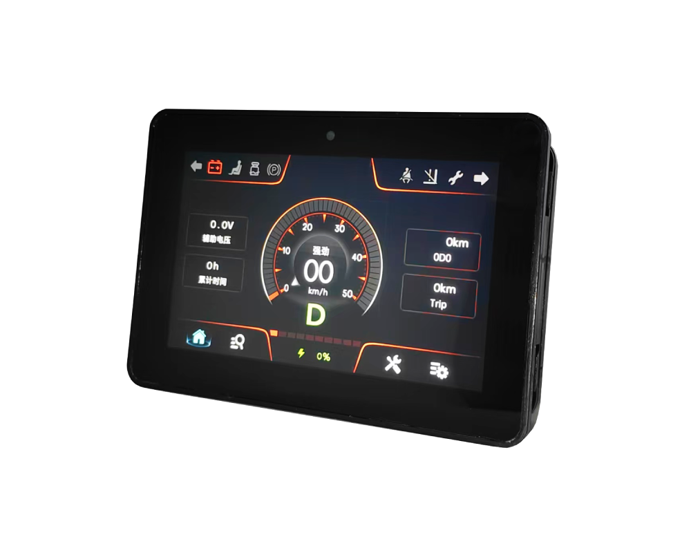 These two 5-inch touchscreen forklift meters can display real-time vehicle status and operation info: traveling speed, working modes (forward/backward, high/low speed), electric/combustion forklift data (battery voltage/level or fuel level/water temperature), fork height, load, mileage and time; they integrate fault codes, alarm prompts (overspeed, low battery, etc.) and maintenance reminders, supporting touch interface switching. They provide drivers with comprehensive status monitoring, ensuring safe and efficient operations.