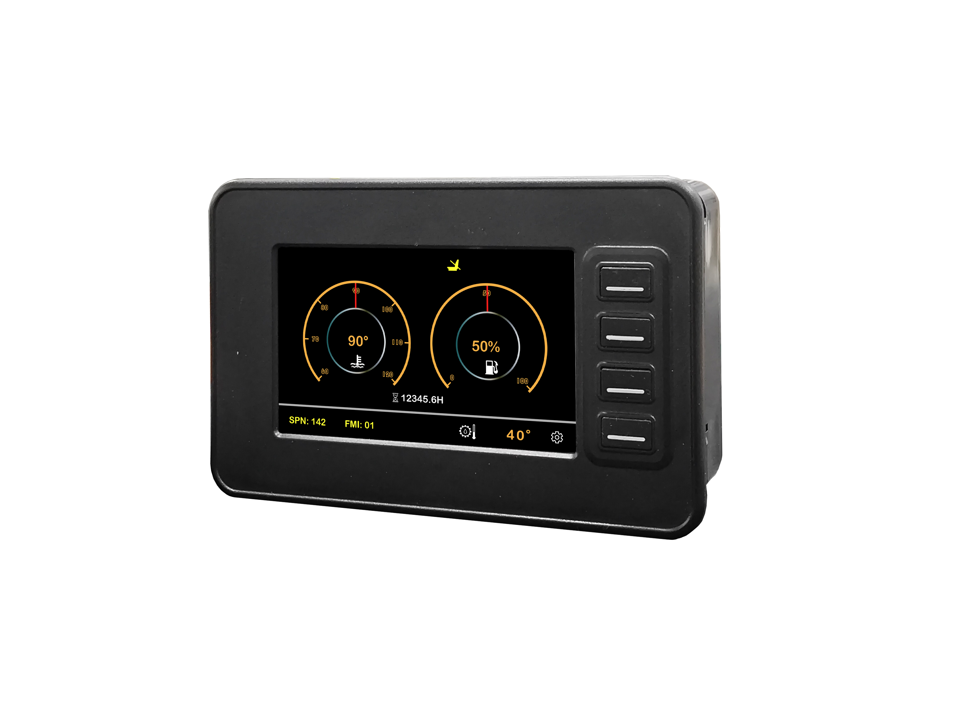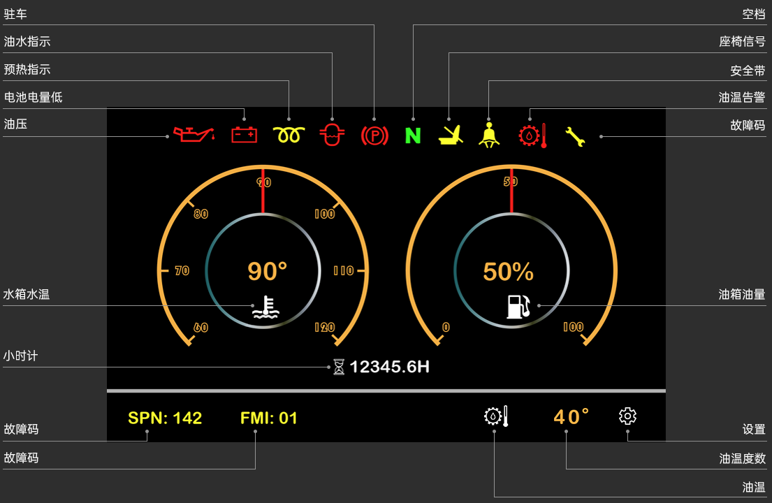 智能化触摸屏仪表主要用于叉车等车辆运行时的状态显示,如工作状态、速度、角度偏移、报警提示、故障提示等;具有CAN总线可与车辆的其他电器系统进行信息互通,并将其他电器传输的信息进行解析送显,同时可以由仪表修改其他电器的部分参数。